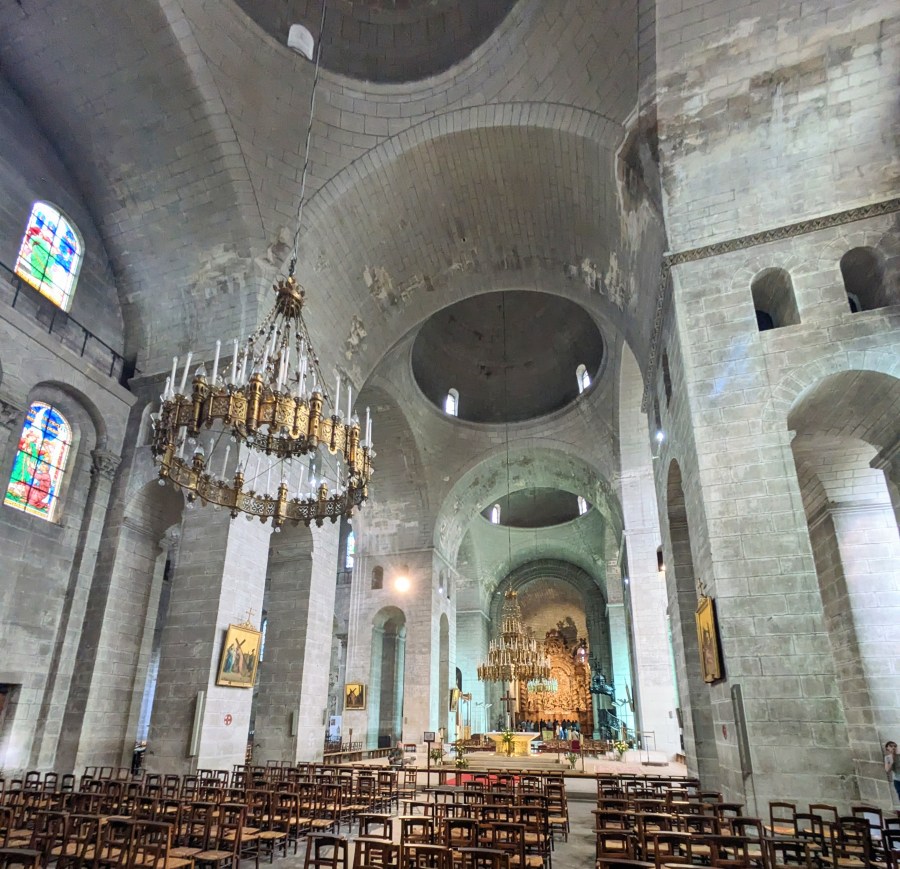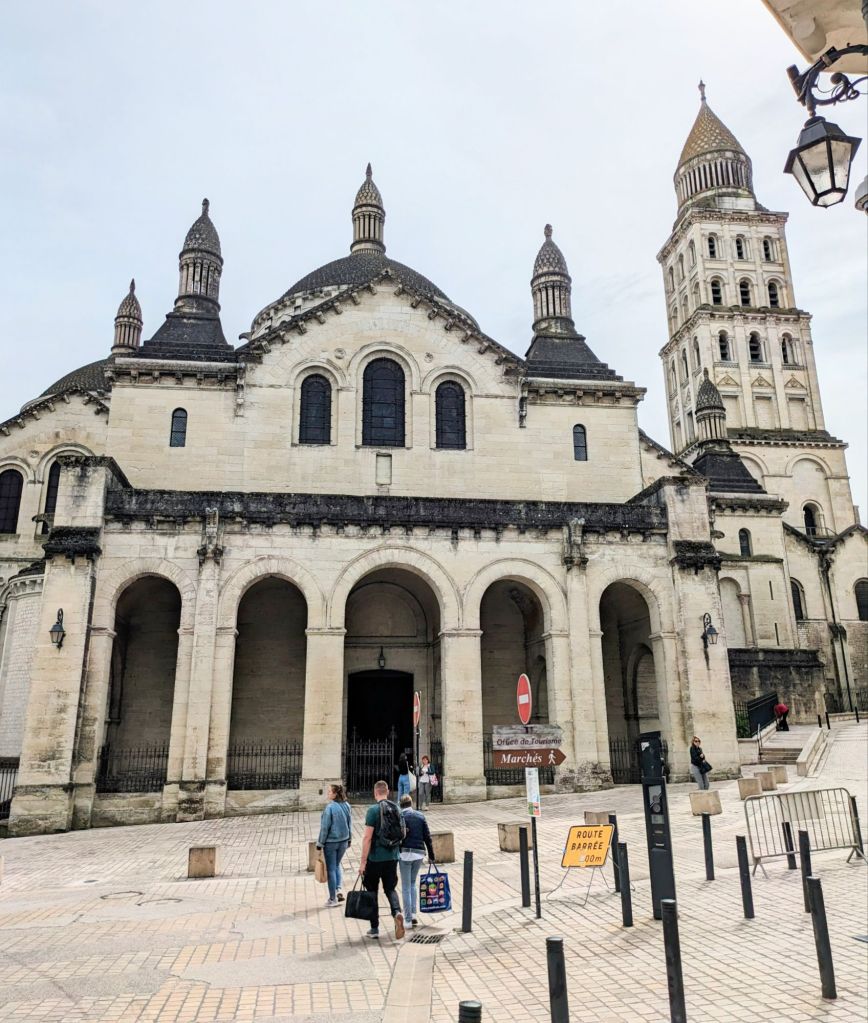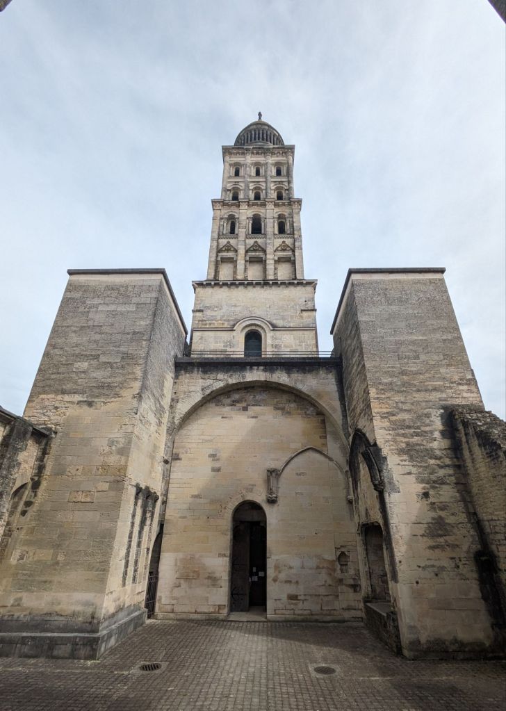 Fabienne had caught up with me and we walked down into the delightful old town of Périgueux (the less said about the environs the better). The old town is dominated by the Cathedral of St Front, whose nave consists of a sequence of wide barrel vaults, interspersed with domes.it is a most impressive building. We got our crédentials stamped by their Sacristan, who said he knew Southwell Minster.