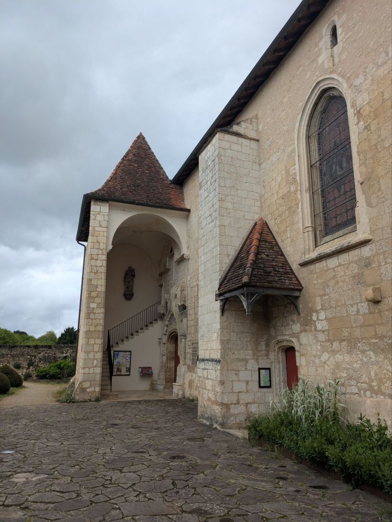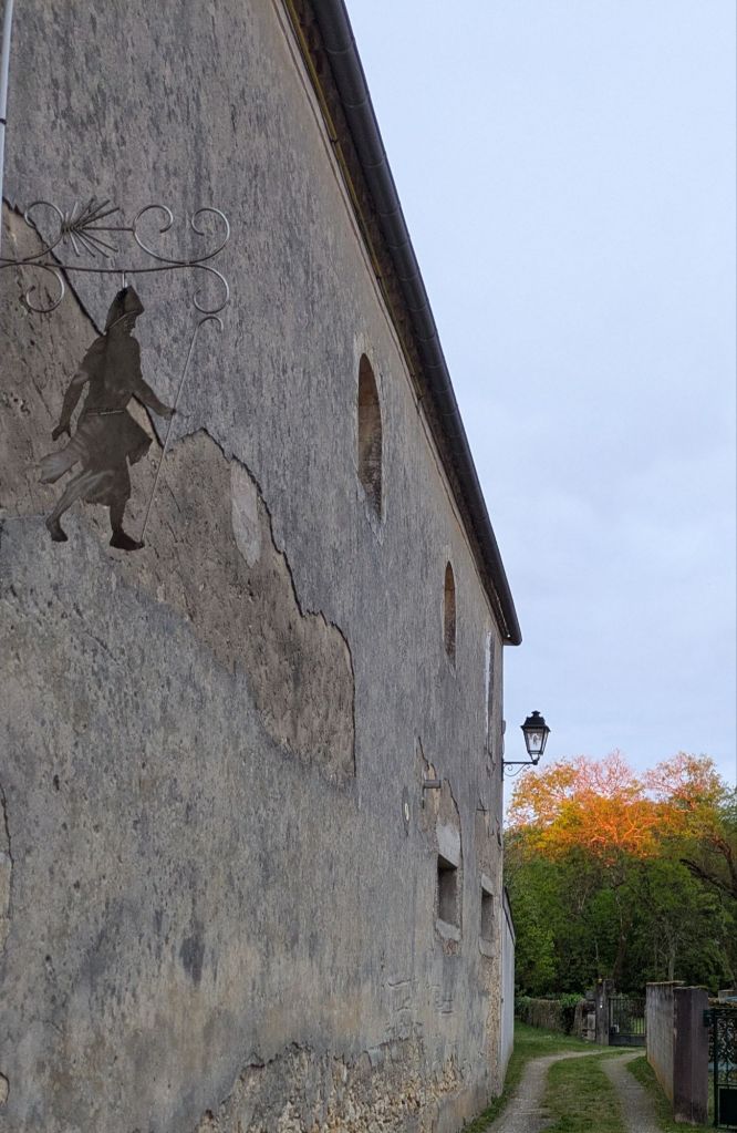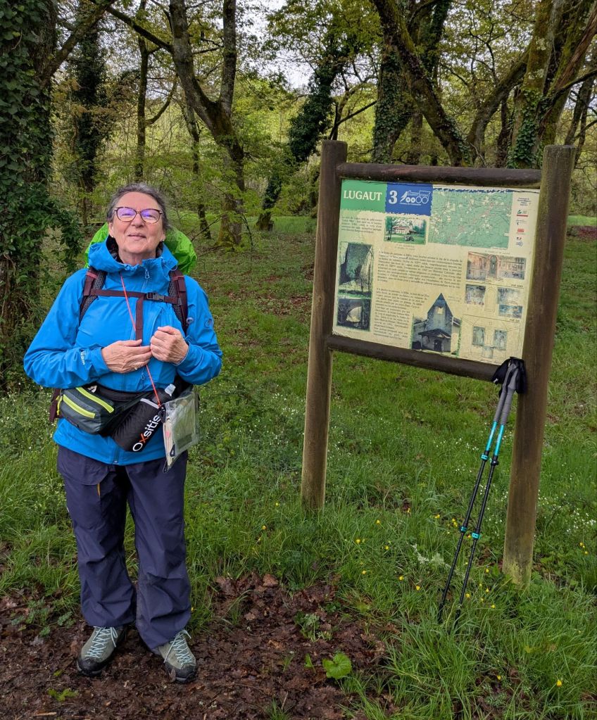 Annie by the sign for the old chapel in the woods at Lugaut. Famed for its medieval wall-paintings, it wasn’t worth turning off to investigate. Fermé.