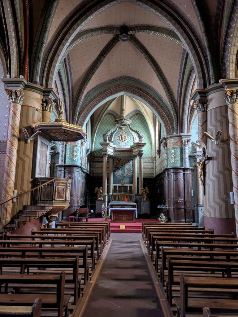 The day was much less humid, with only a few spits and spots of rain, and a good bit warmer – so it felt like good walking weather. We walked and talked – if you find someone sympa, as the French say, then the conversation flows. And then sometimes we were comfortably silent. The path was not miserably straight, so we had the pleasure of discoveries round corners.