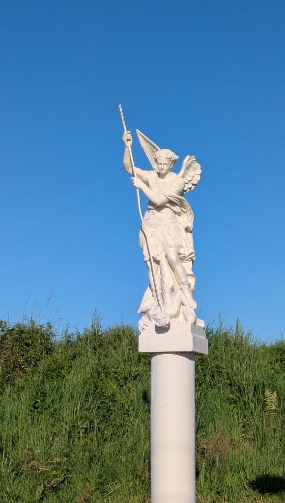 I took it to be Saint Michael subduing a fallen angel, maybe Satan? Others may know better. I tend to stop and say a brief prayer for the place and the people when I pass these shrines. In some of France they can look rather forlorn, but round here the high level of upkeep and planting of flowers around them speaks of local pride and care at least.