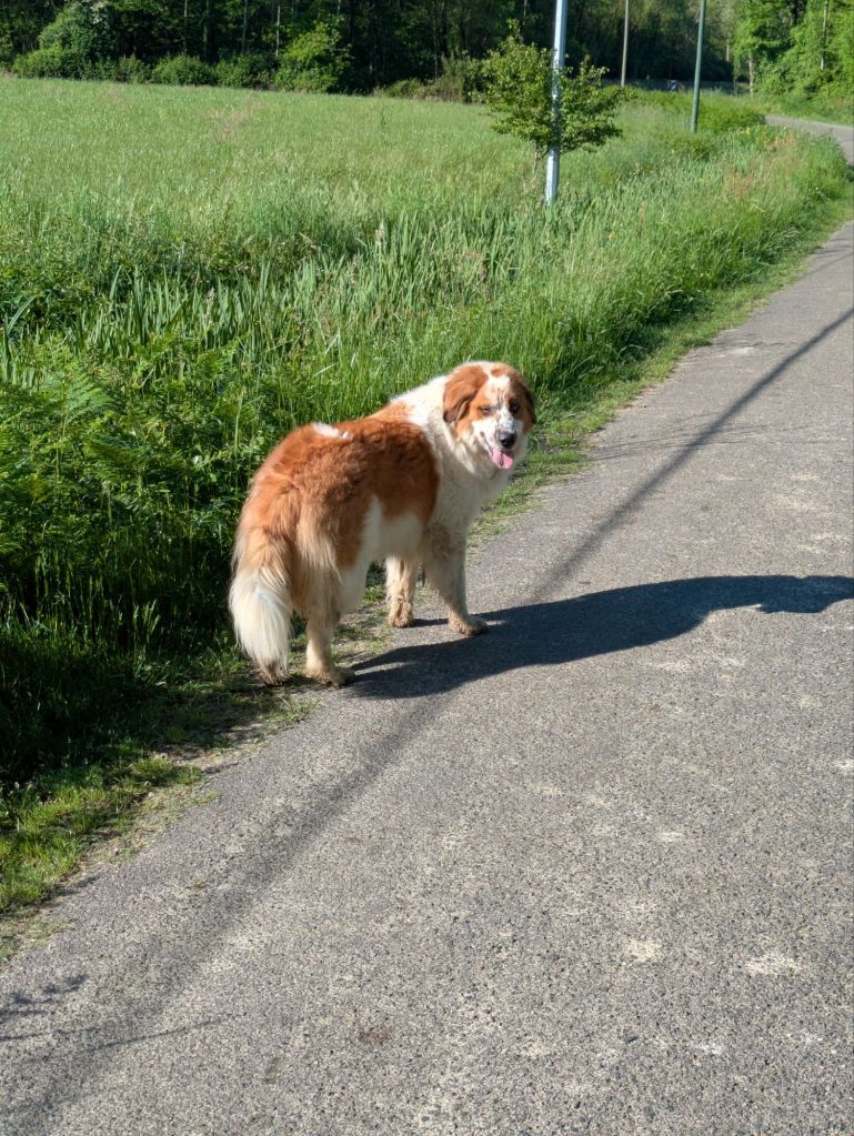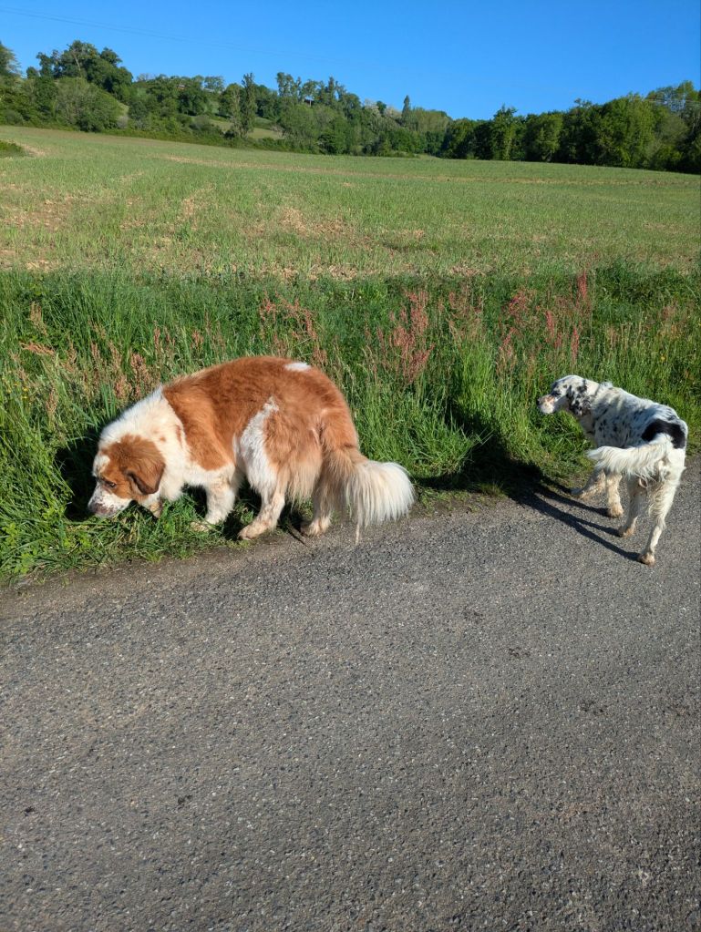 One looked like an English Setter, and the other I took for a Pyrenean Mountain dog.  We walked together for 500 metres or so, when the setter’s owner, came down the road and called “Louis” home. But the big hairy one came on with me for a good mile or so, quite unconcerned; trotting ahead and then turning round as if to say “Come on, catch up”.