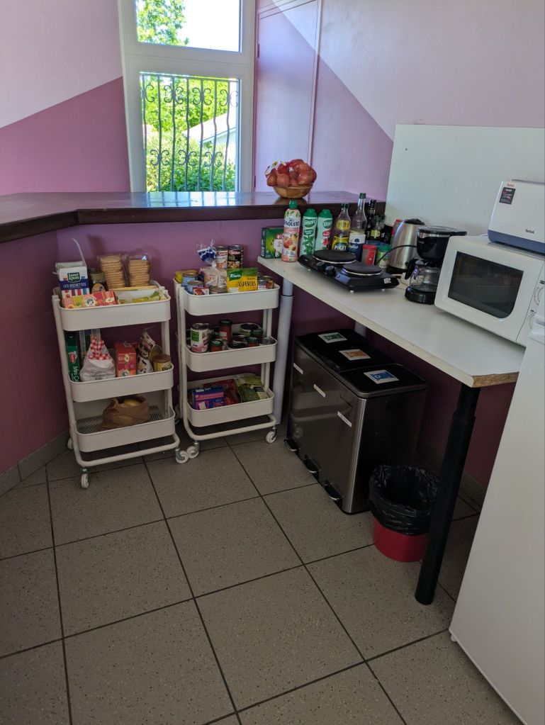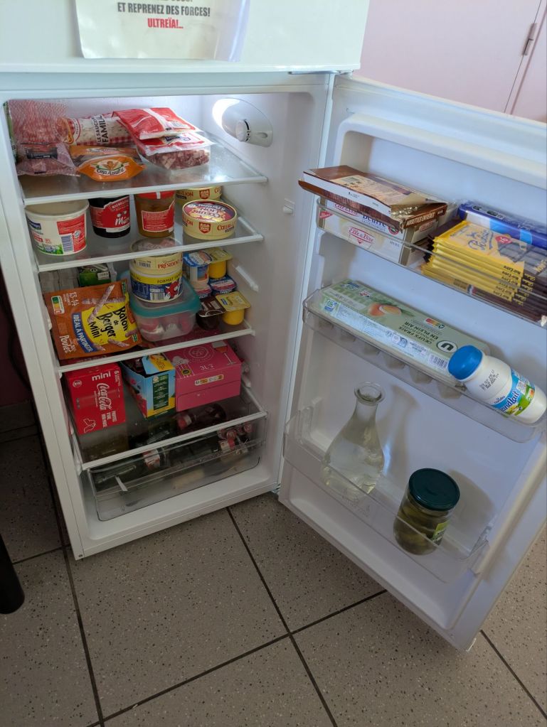 As is usual in these places, they give you a disposable paper sheet and pillow case (less dreadful than they sound), and have heavy blankets to supplement your sleeping bag. The showers are hot (excellent French plumbing), and here, where they ask for a pilgrim donation, they use it to give us the best stocked kitchen I have ever seen in such a pilgrim refuge.