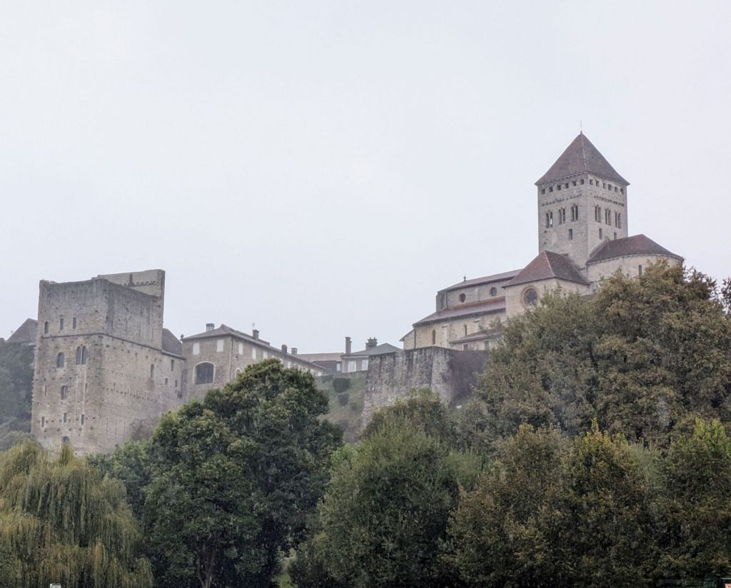 Sauveterre de Béarn is a stunning fortified village on a cliff above a river, guarding Béarn from Navarre to the south, and the Basque country to the west. It loomed out of the rain and mist.