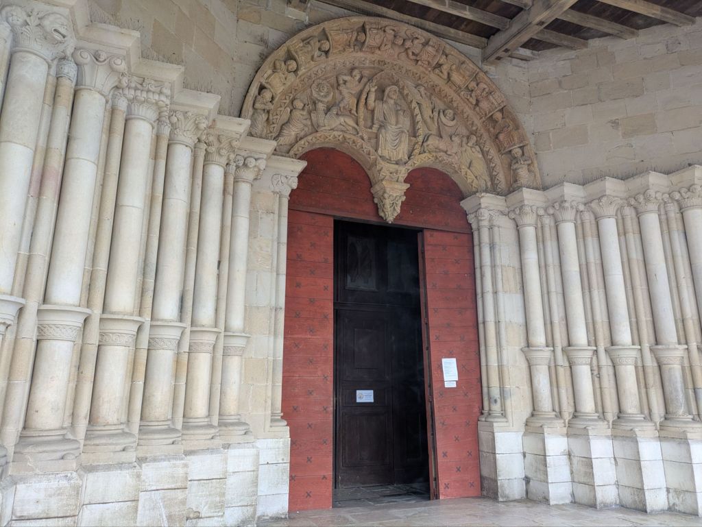 Accessing the ramparts meant a climb of 172 steps, but I didn’t care, I just wanted to get out of the rain. Luckily, the church had a Western porch, with (dry) seats, opposite the most impressive XII C tympanum and door. I took refuge.
