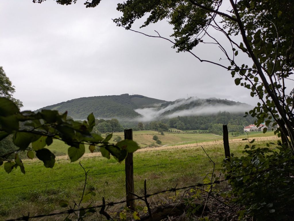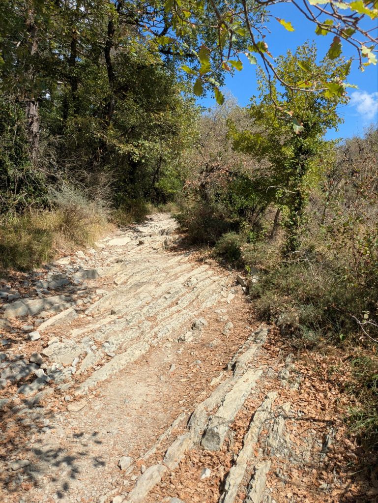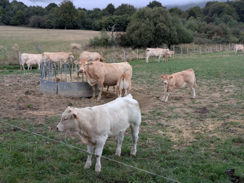 This was a day’s walk on a general downward trajectory, passing through forests and by fields, though not without some steep climbs. The day was overcast and cool until the afternoon when the sun broke through. The music of the last few days has been that of bells, large and small, around the throats of sheep, goats, cattle and horses. All these bells, at their own pitch, carry a slightly muffled sound (I think because they don’t necessarily have metal clappers, or those clappers and their bell are not cast to produce a profoundly resonant sound?) which nevertheless carries across huge distances.