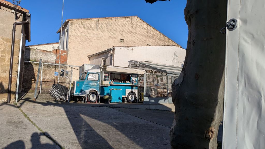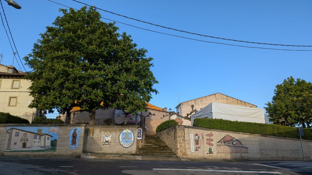 There was no warning in the dawn colours, the light cloud soon began to dissipate and the sun came out. Seven kilometers later and I was coming to Grañón. There was a fine welcome for pilgrims, and a first rate breakfast van.